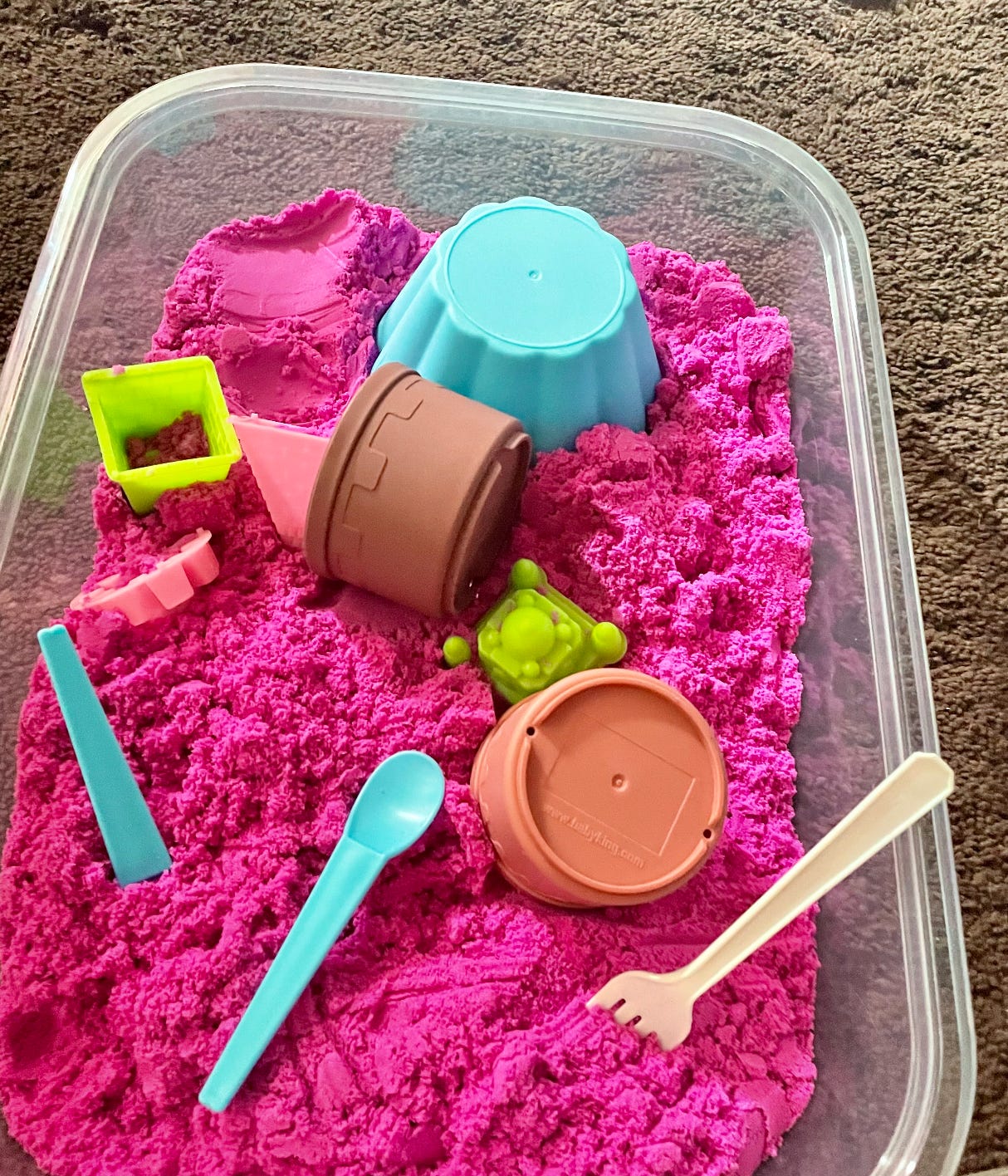 I bought some kinetic sand that was pink and added little toys from a dollar store. Using a plastic container keeps the mess contained + portable. Playing with filling molds or just scraping the surface with a fork has been fun and grounding (both of which I can use more of!)