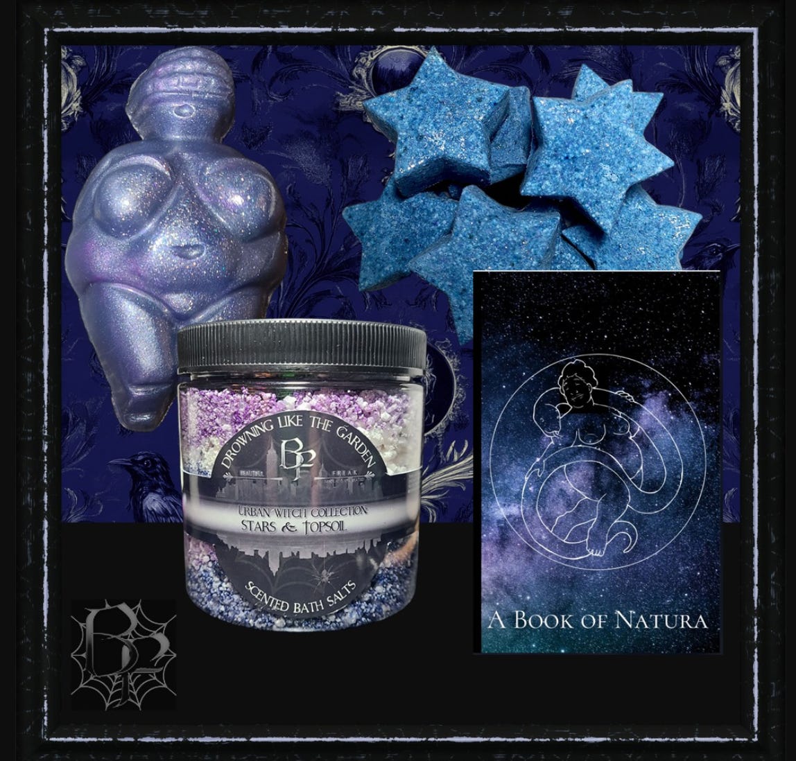 The soap bar is reminiscent of the Venus of Willendorf figurine that's roughly 30,000 years old, the stars are shower steamers and the jar contains similarly color-themed bath salts. (I used the salts last night and they’re glorious and shimmery). The journal (designed by me) contains a self-love ritual + spell written by Sara Mastros.